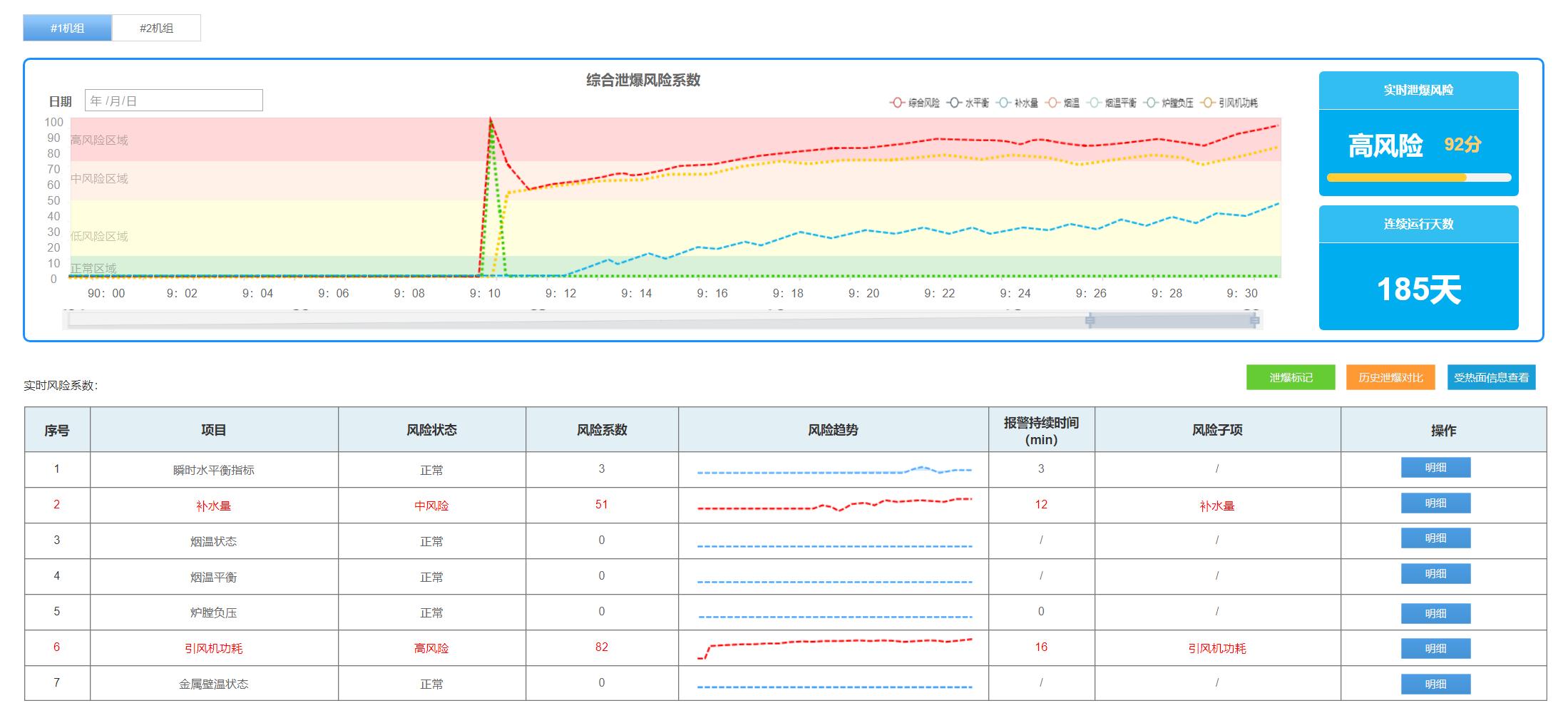 以系統(tǒng)的某電廠實(shí)際案例示例,該電廠防磨防爆可視化管理系統(tǒng)泄爆風(fēng)險(xiǎn)監(jiān)控頁(yè)面顯示,1號(hào)鍋爐在上午9:10膛負(fù)壓指標(biāo)、綜合風(fēng)險(xiǎn)指標(biāo)突然上升,隨后爐膛負(fù)壓風(fēng)險(xiǎn)指標(biāo)逐漸下降,同時(shí)引風(fēng)機(jī)功耗、水平衡指標(biāo)先后逐漸升高。點(diǎn)擊相關(guān)異常項(xiàng)目,分析風(fēng)險(xiǎn)指標(biāo)的發(fā)展曲線以及歷史數(shù)據(jù)偏離特征后,初步判定為鍋爐爐膛水冷壁可能存在泄爆,立刻協(xié)調(diào)人員進(jìn)行現(xiàn)場(chǎng)勘查。