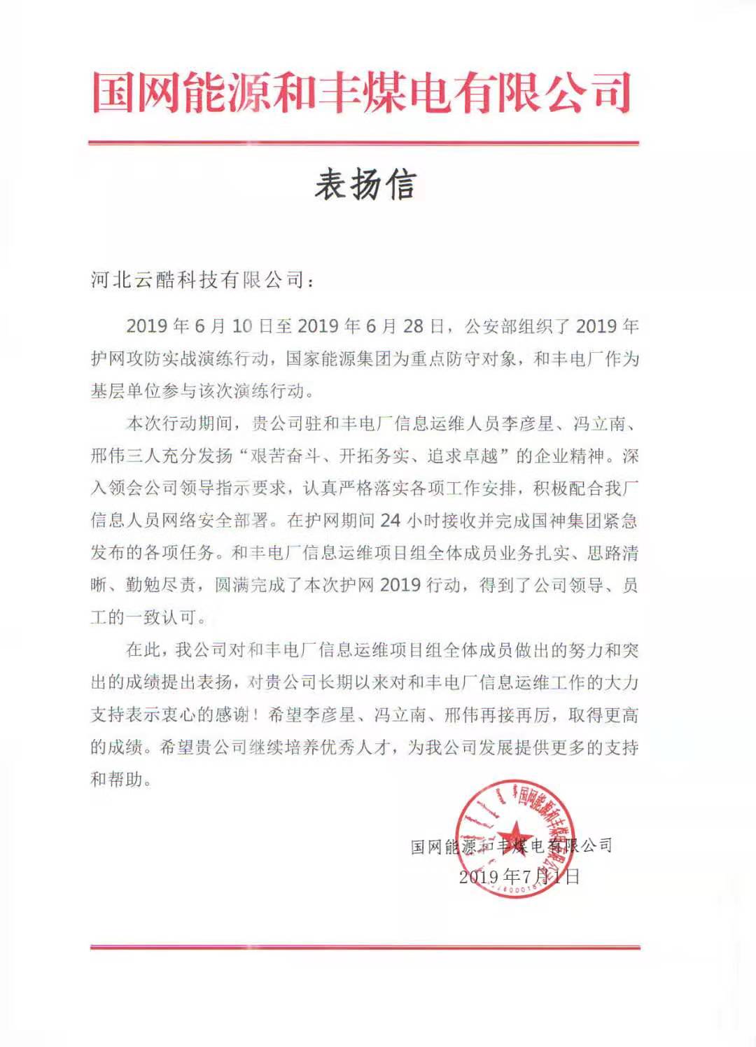云酷科技運維服務部的四位同事憑借優異的技術實力和敬業精神,在本次的演練行動中獲得某煤電有限公司的高度贊揚,并向我司發來了表揚信: